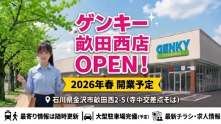 石川県金沢市畝田西に「ゲンキー 畝田西店」が2026年春頃オープン予定。場所・地図・営業時間・チラシ・求人情報を、確認できた情報に基づいてまとめます。