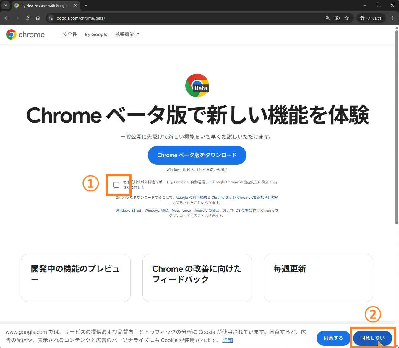 ここでは、①使用状況・障害レポートのチェックを「OFF」、②Cookieの同意/拒否を「同意しない」で進めています。
