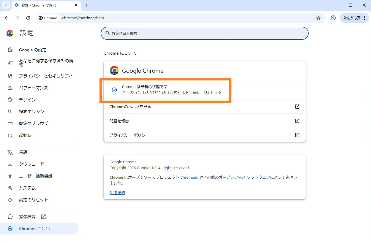 | Chrome バージョン | バージョン:145.0.7632.45 ビルド:公式ビルド アーキテクチャ:64ビット |