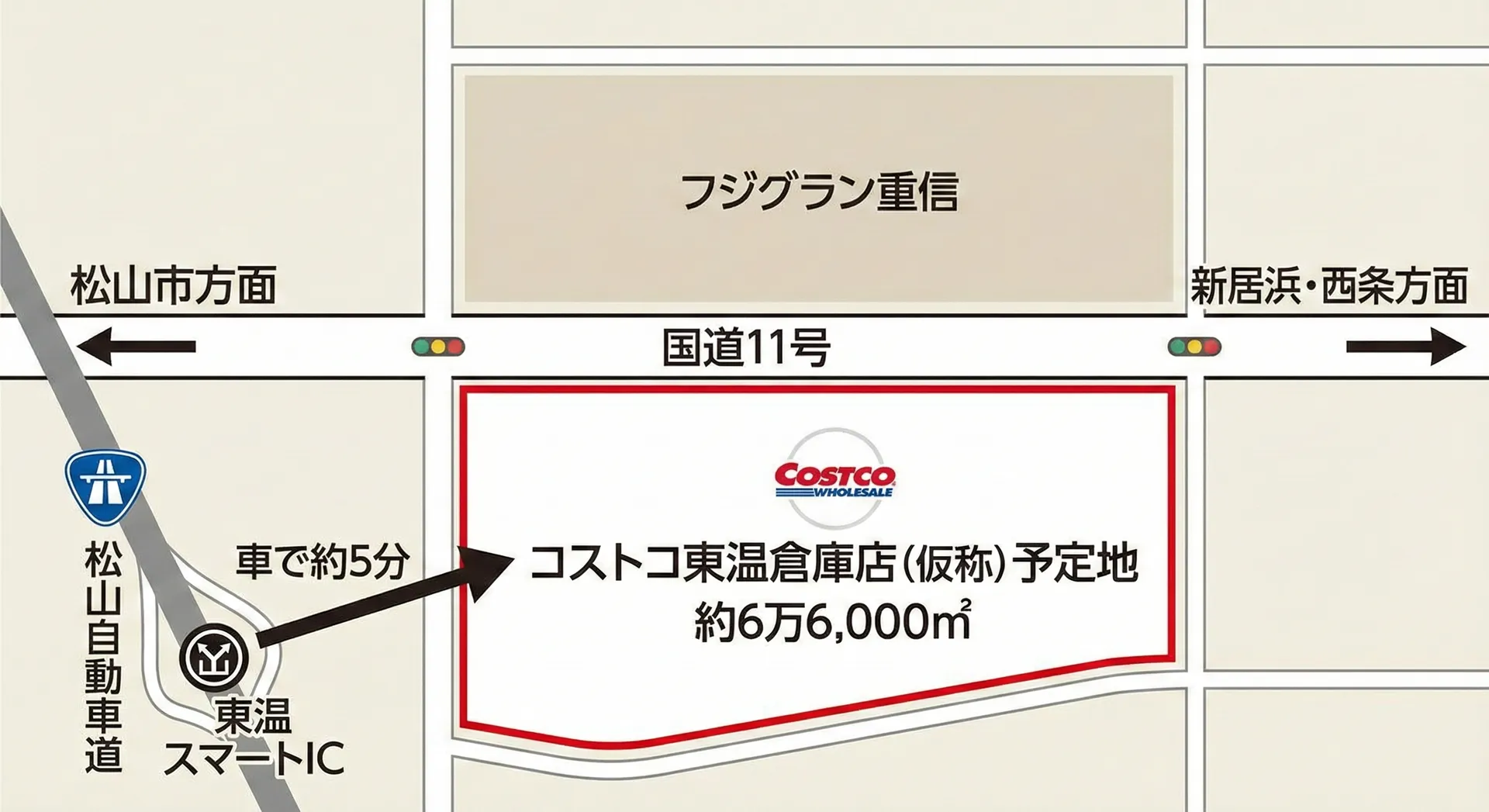 コストコ東温倉庫店(仮称)は、車でのアクセス性を最重視した立地として報道されており、四国全域からの来店を想定した交通利便性の高さが特徴です。