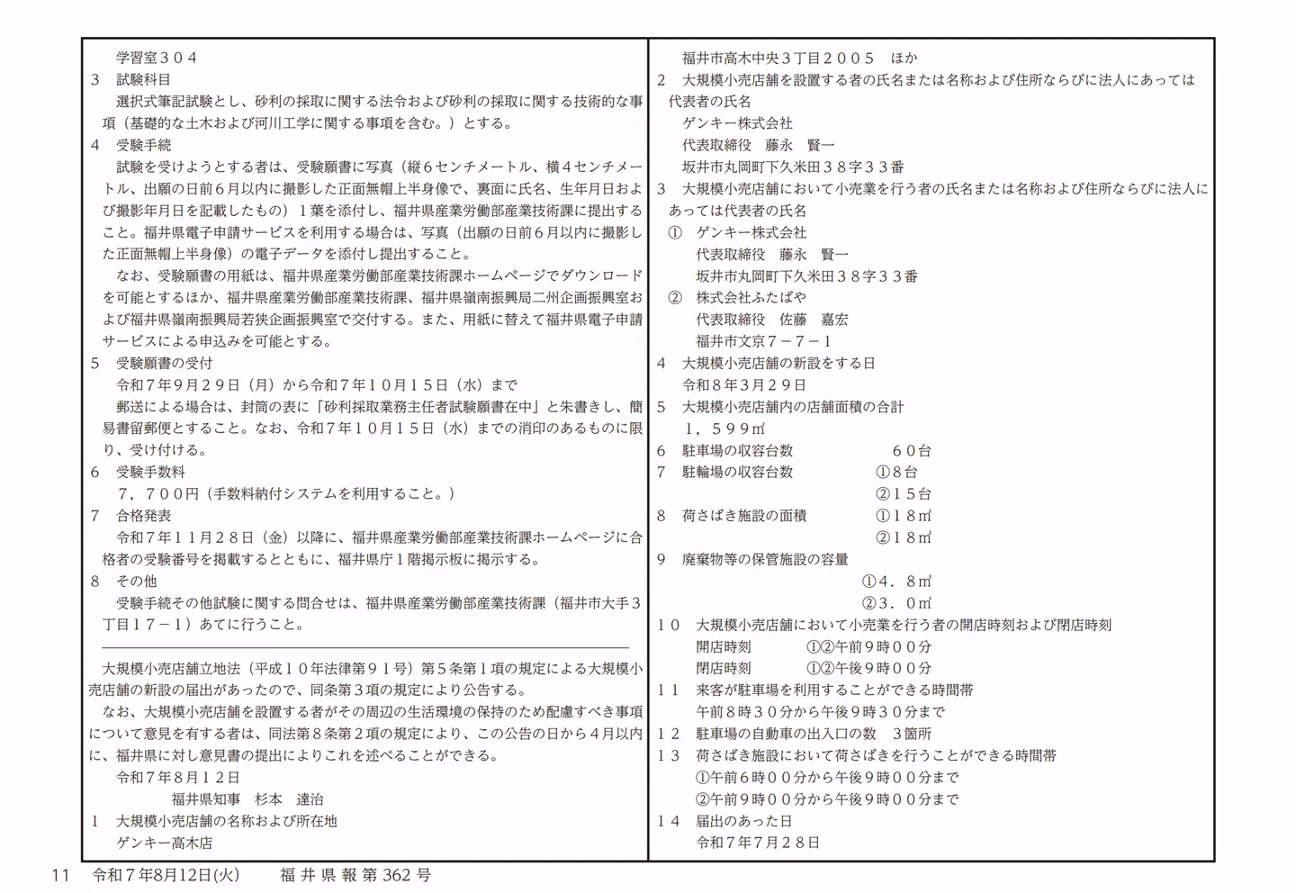 福井県公報 第304号(令和7年7月28日)/ゲンキー高木店 大規模小売店舗立地法公告