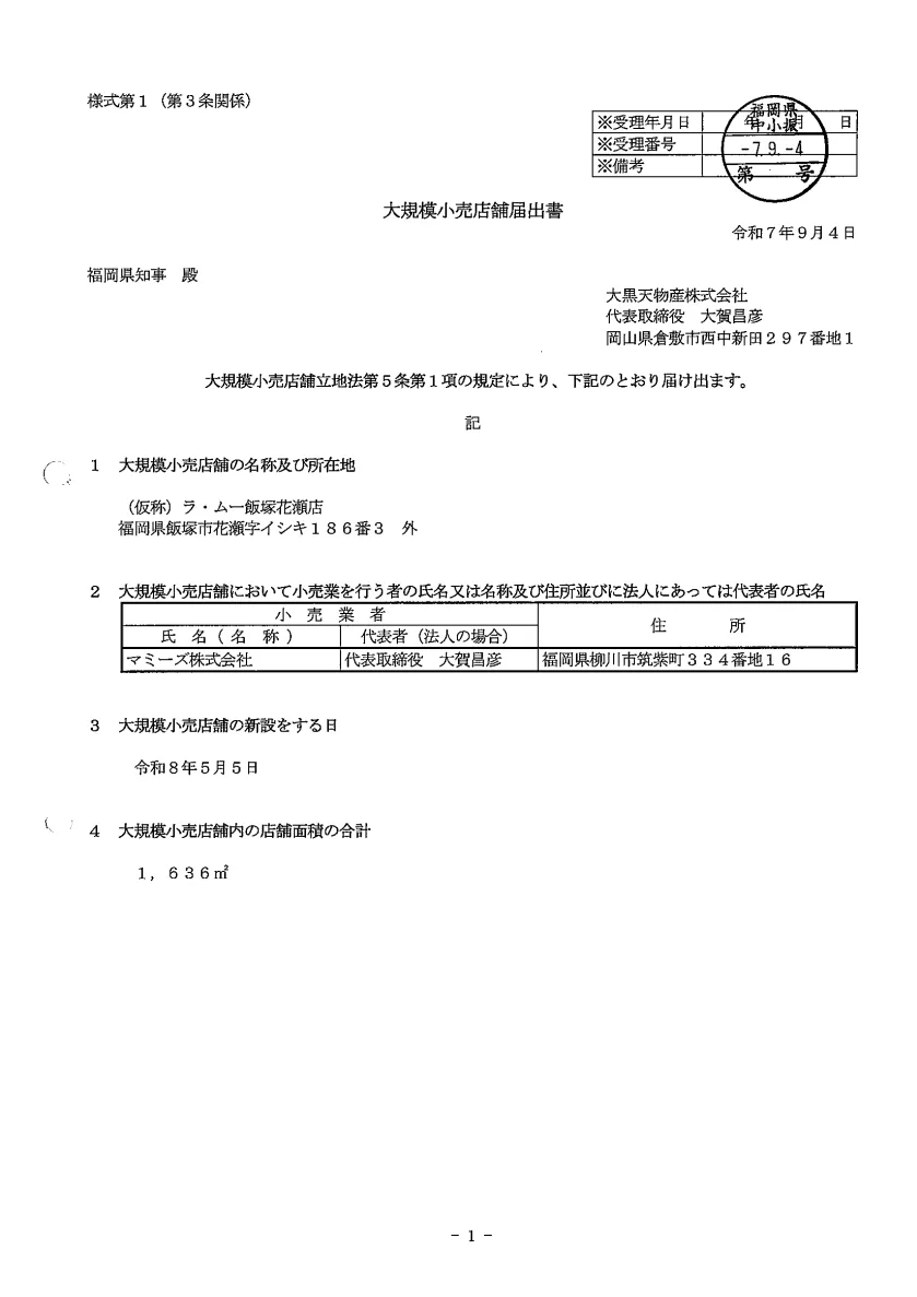 大黒天物産株式会社が設置者、マミーズ株式会社が小売業者として届出されています。福岡県内では14店舗目、飯塚市内では初の店舗となります。