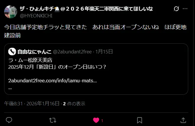 個人様による現地確認コメントであり、事実を保証するものではありませんが、2026年1月中旬時点の現地状況を示す情報の一例として掲載しています。