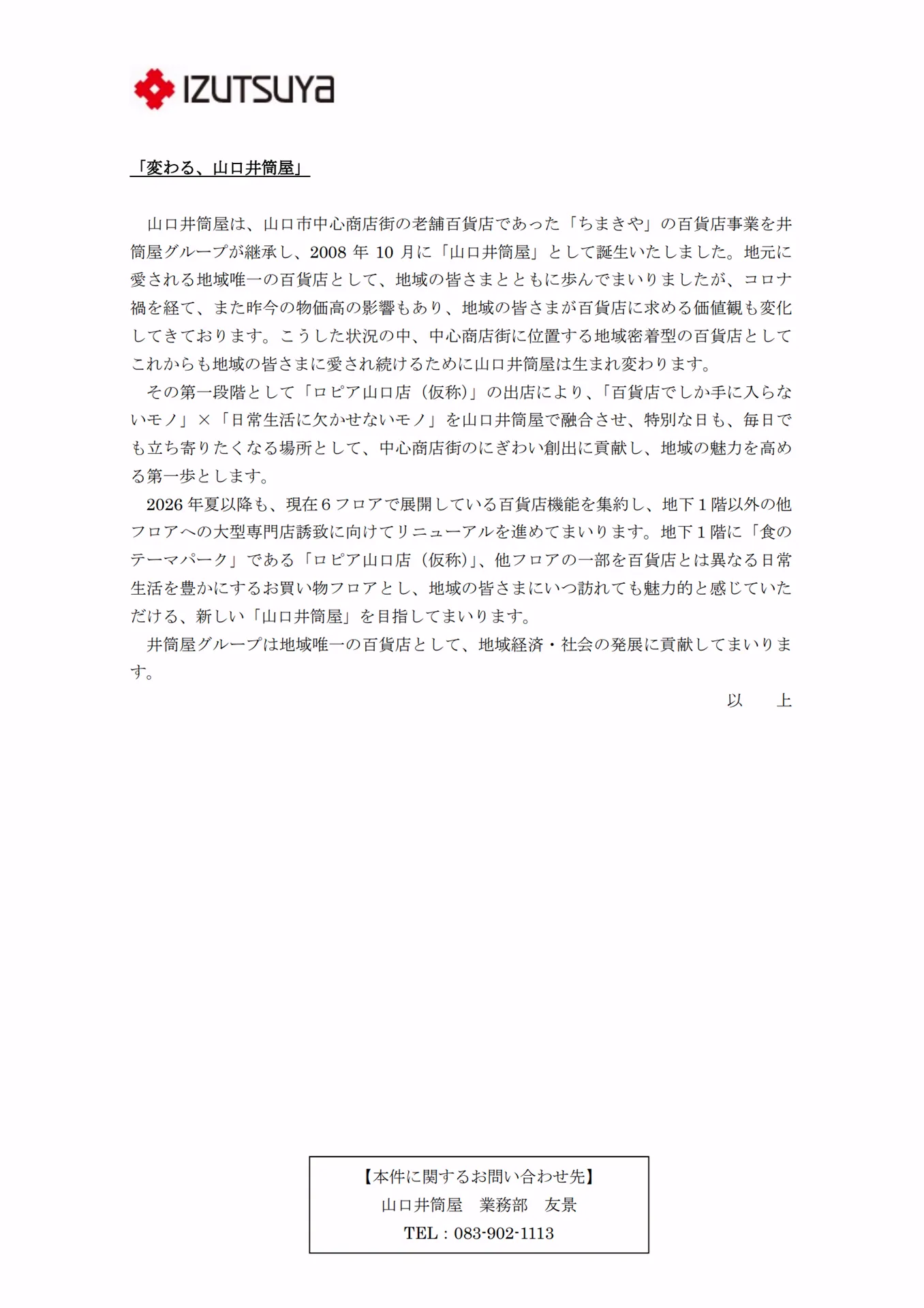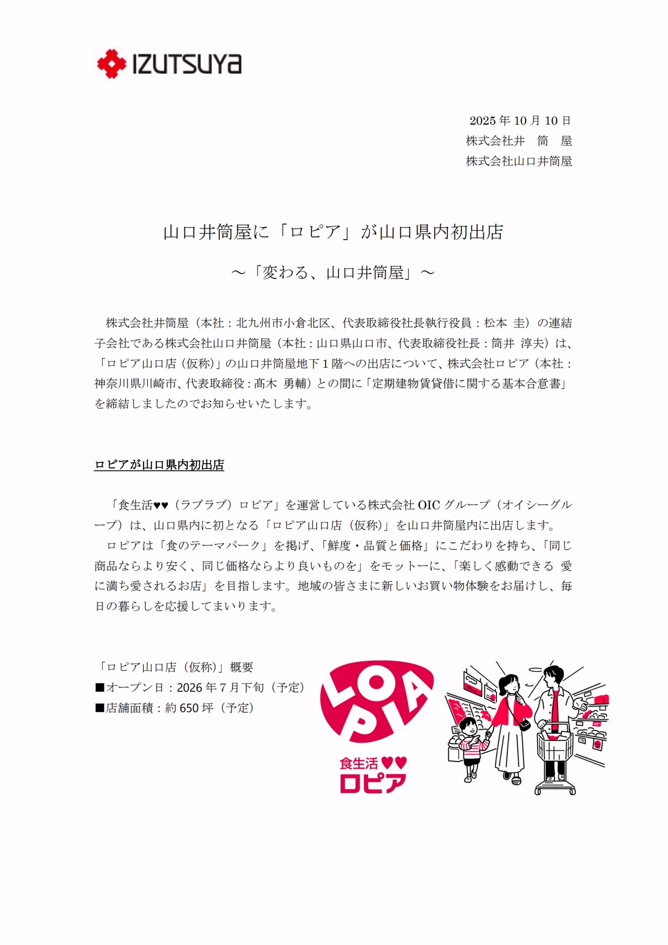 出典:株式会社井筒屋・株式会社山口井筒屋「山口井筒屋に『ロピア』が山口県内初出店」(2025年10月10日発表/公式リリースPDF)
