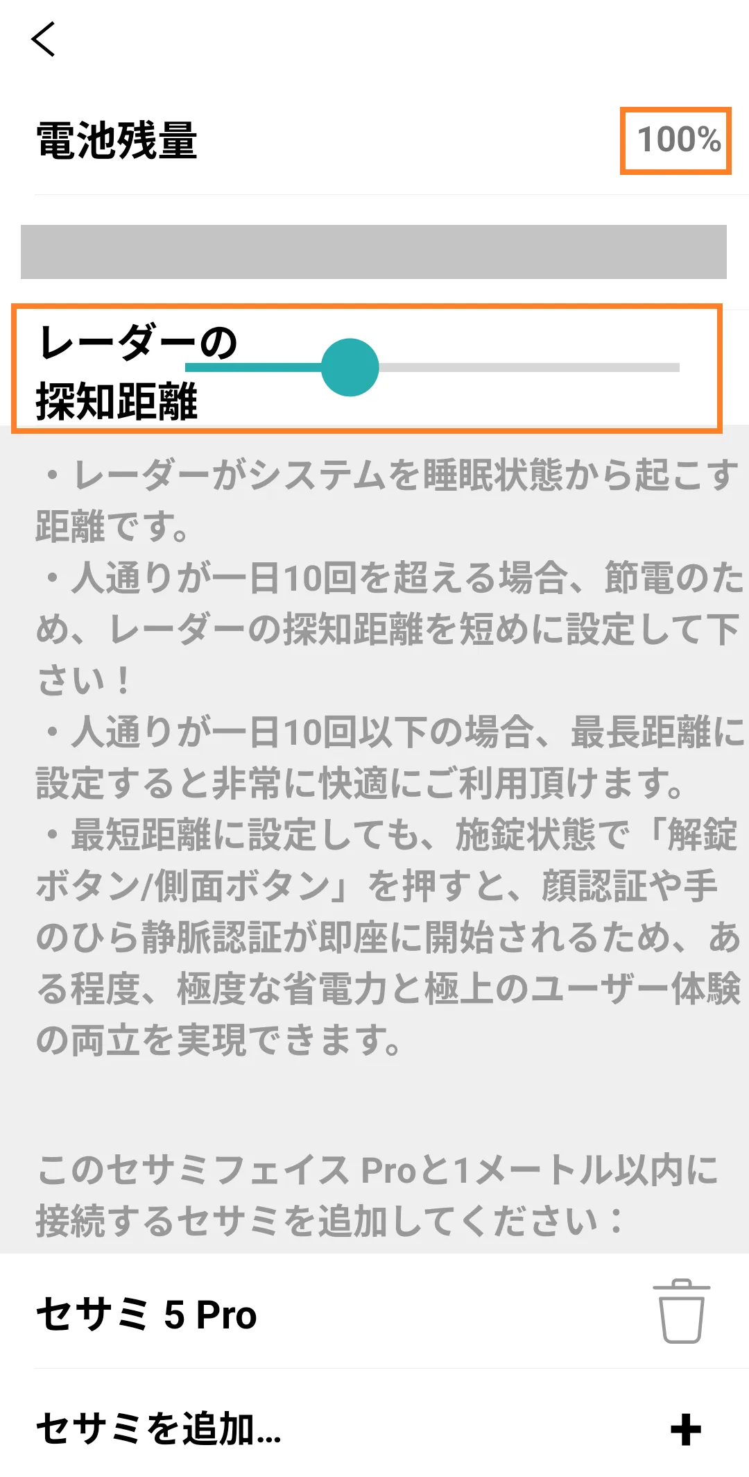 「セサミフェイスpro」をタップし、設定画面を下方向にスクロールすると「レーダーの探知距離」のスライダーがありますので、スライドさせて設定します。画像の状態で107cmです。以前は300cmでした。レーダーの感度の違いは感じません。
