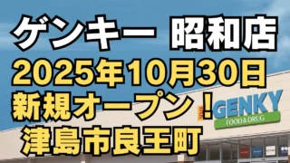 INFO ゲンキー 昭和店はいつオープン? 2025年10月30日 新規オープン予定!アクセス・店舗情報を徹底解説|最新情報まとめ 愛知県津島市良王町にドラッグストア「ゲンキー 昭和店」が2025年10月30日オープン予定。所在地・アクセス・営業時間・求人情報をわかりやすくまとめました。 2025.10.14 INFO